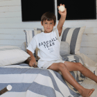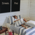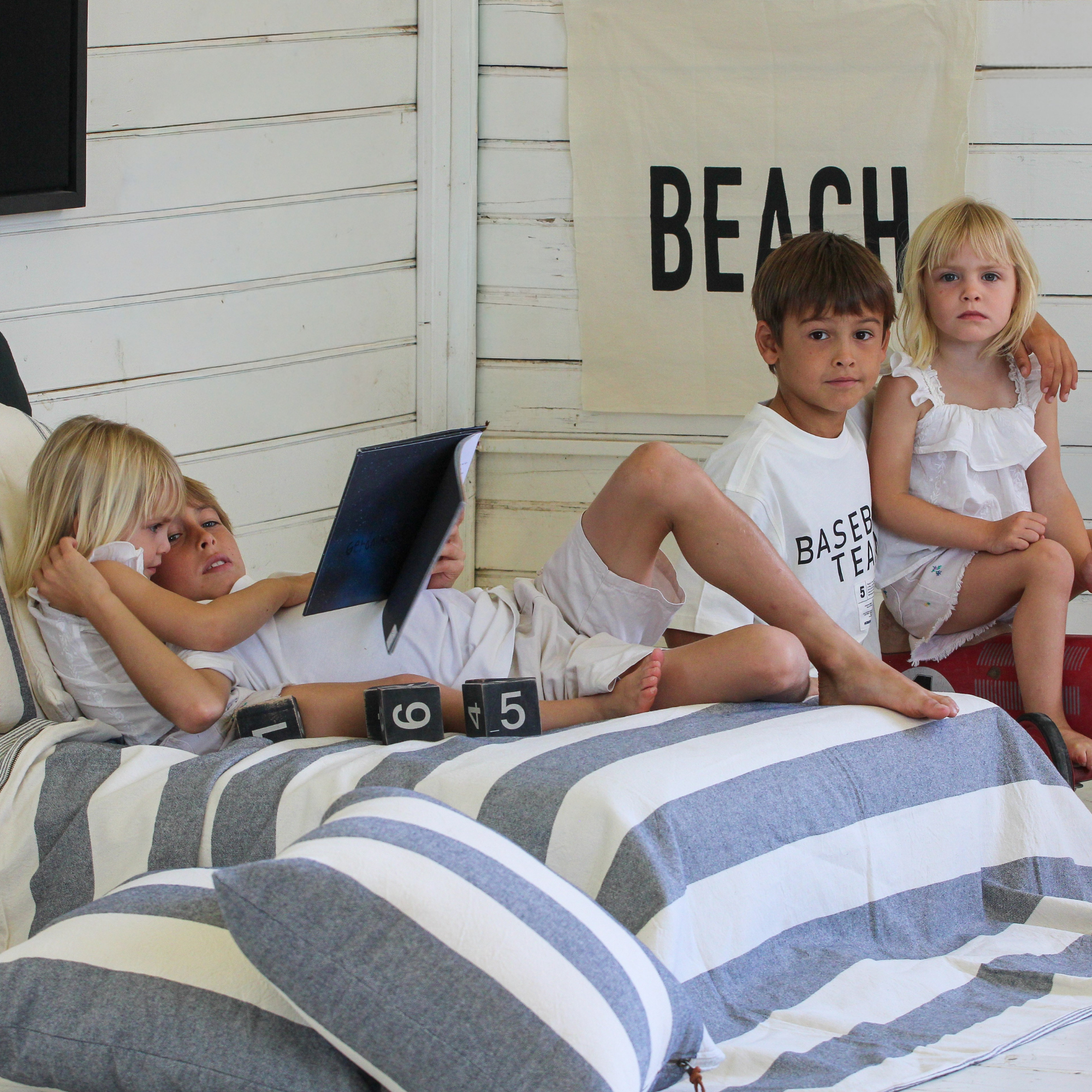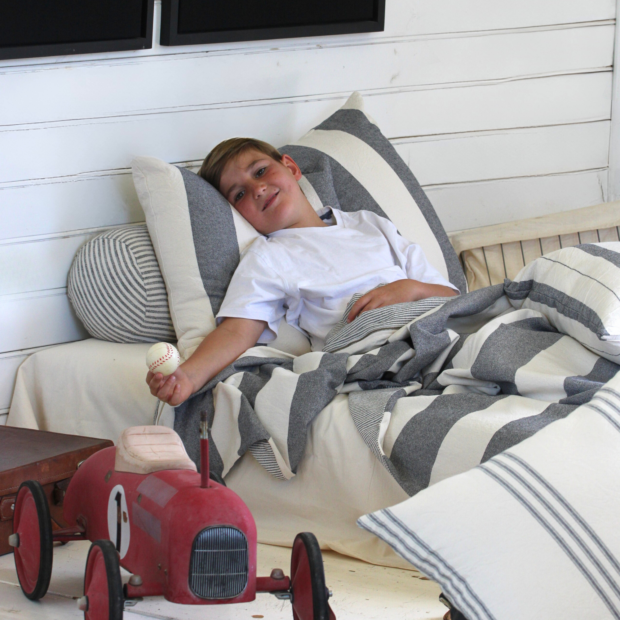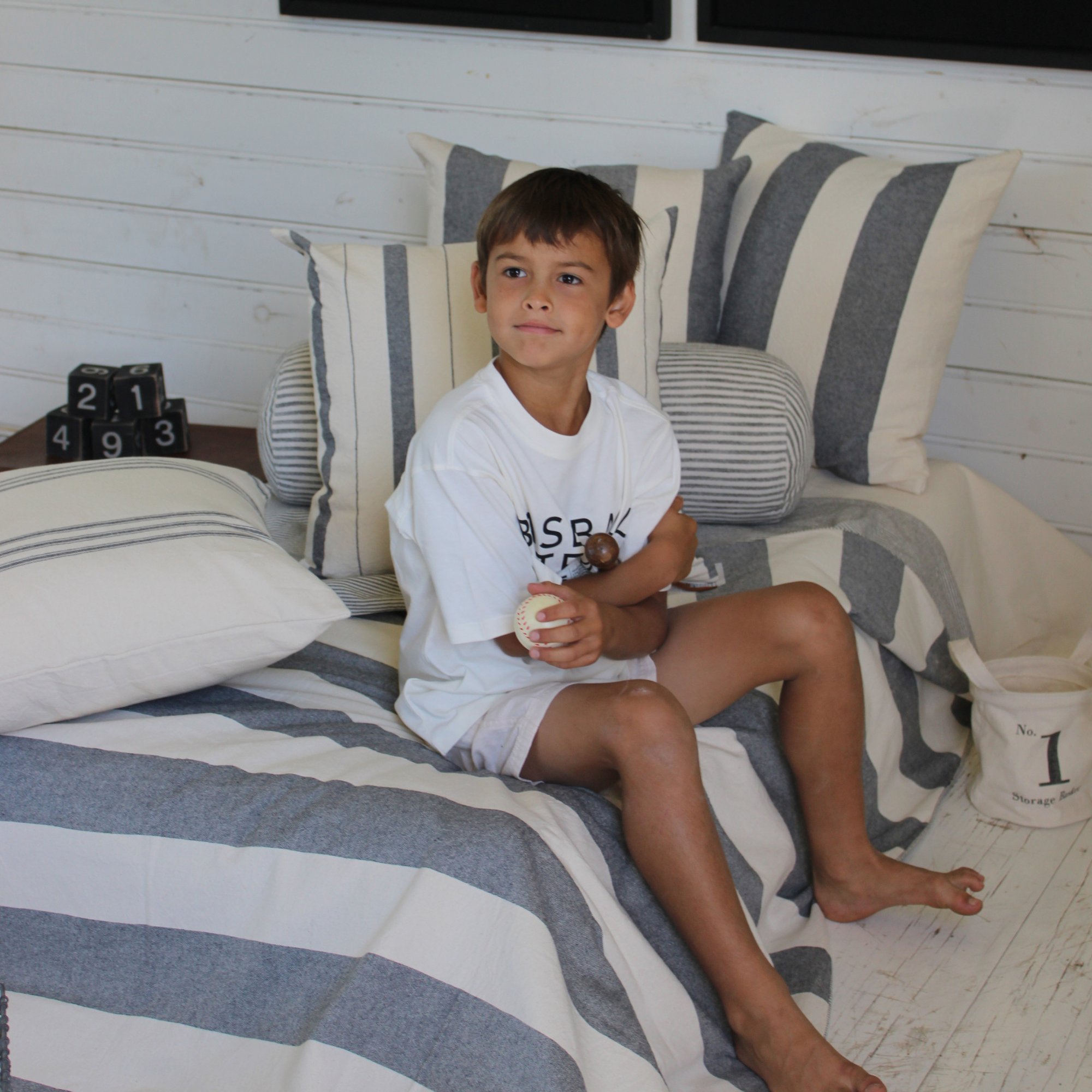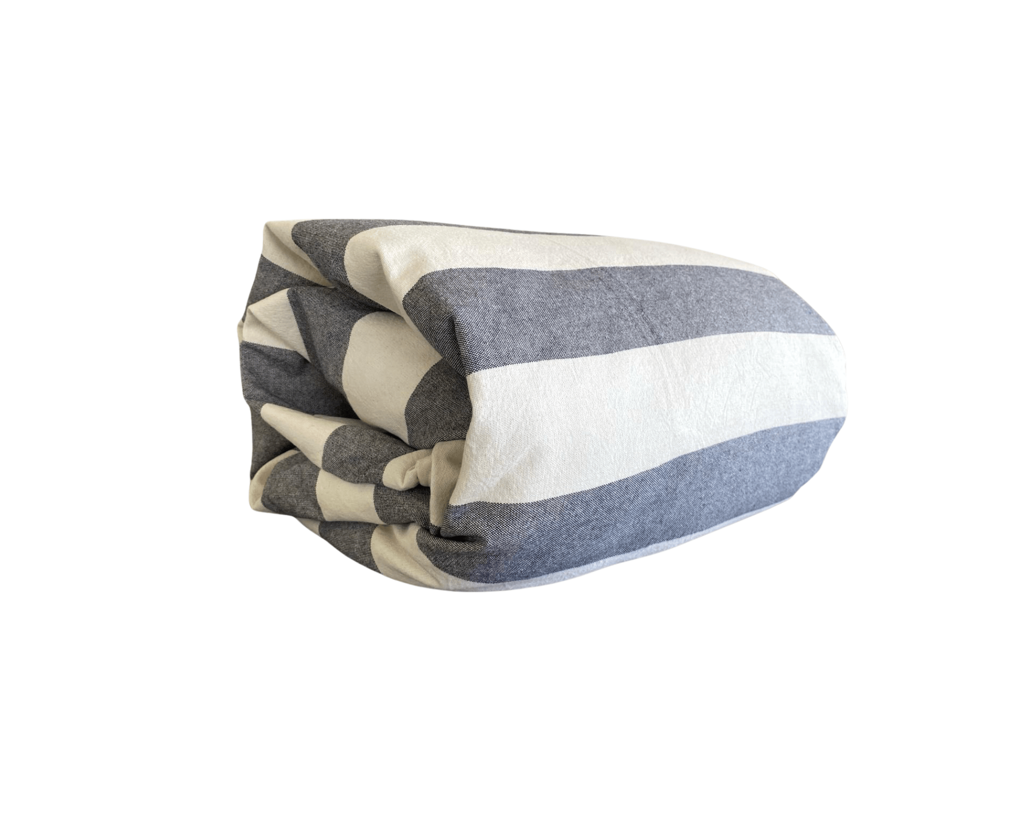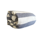 - Diseño a rayas en color crudo y azul marino / reversible en lino y algodón color crudo.
