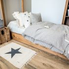 • Diseño a rayas en color crudo y gris/ reversible en lino y algodón color crudo.