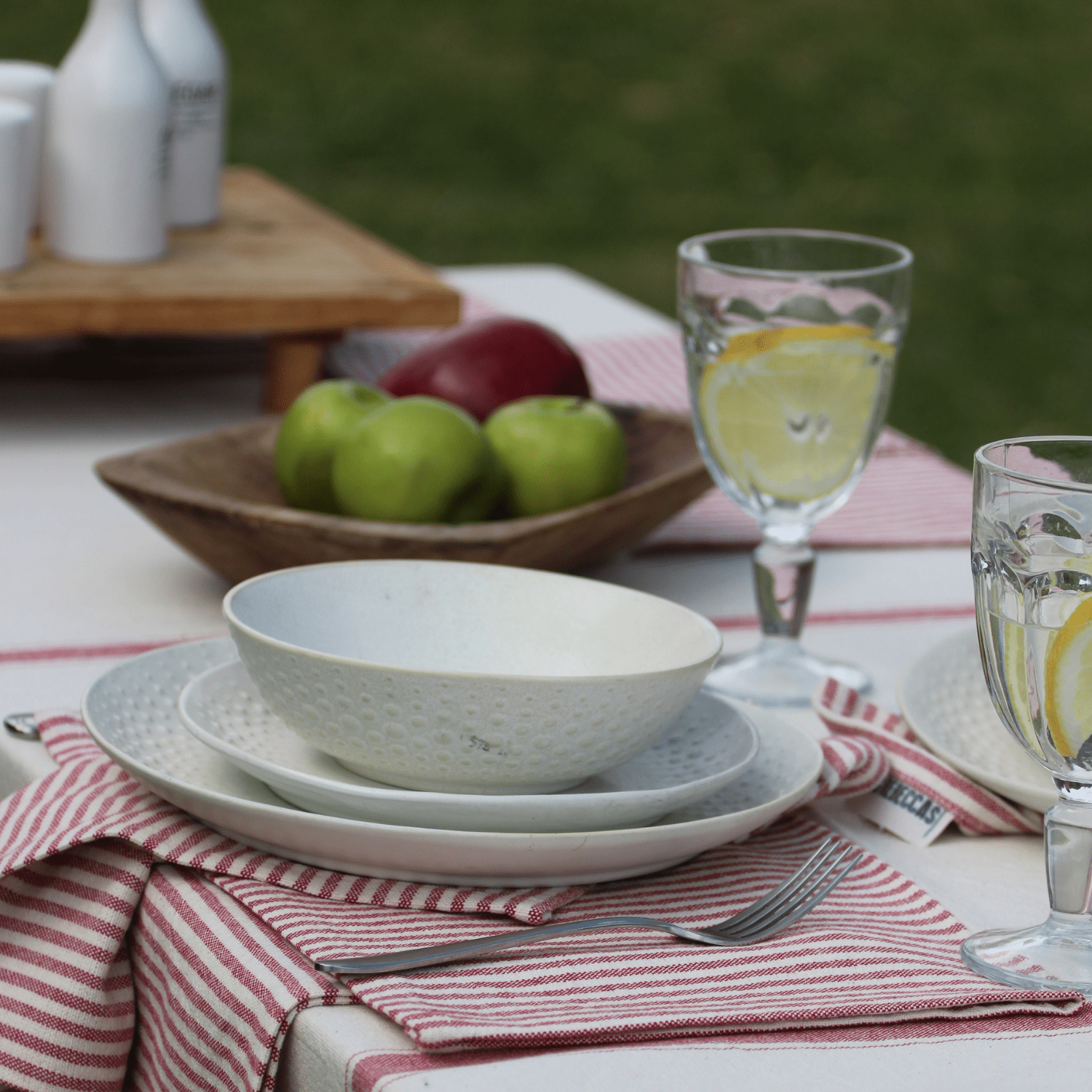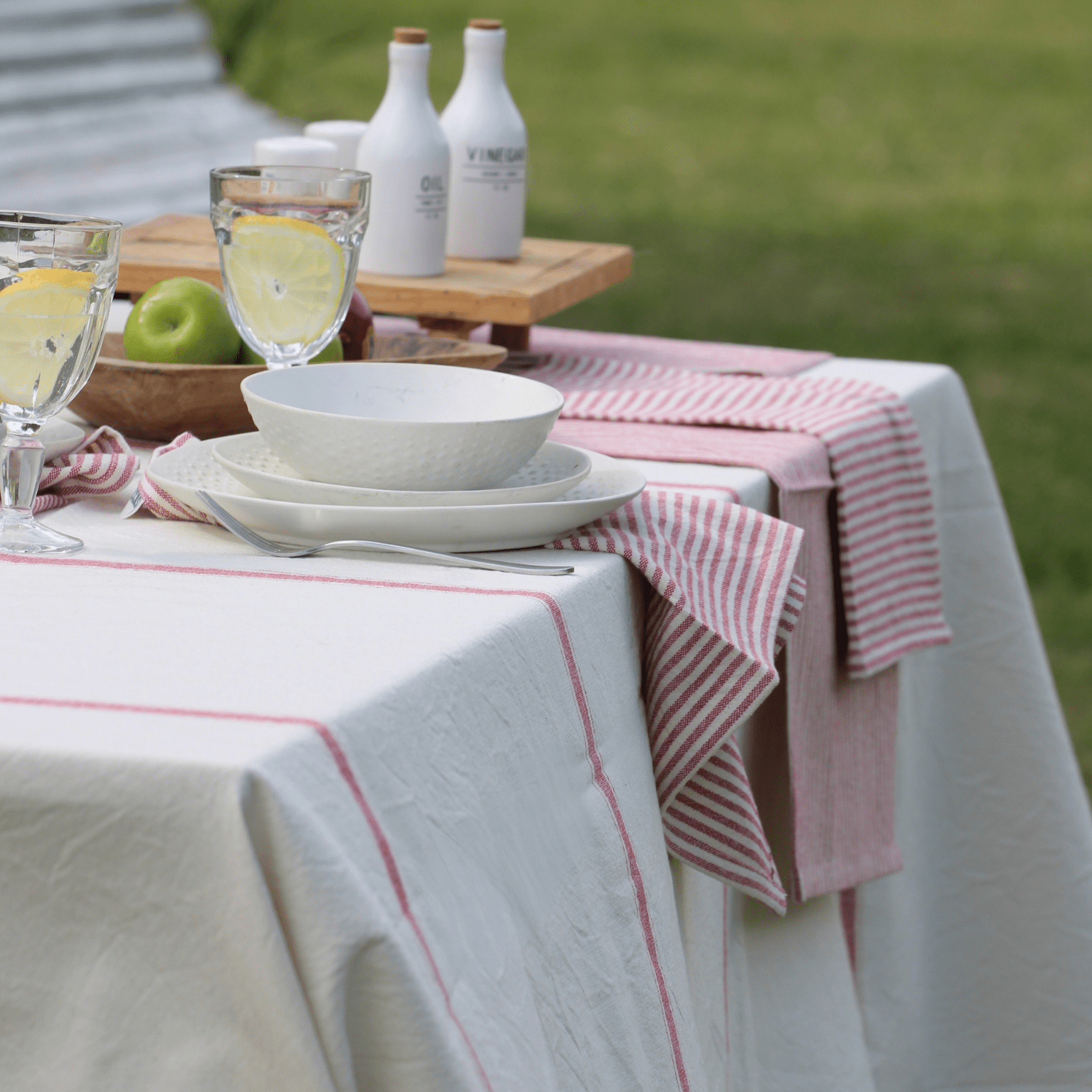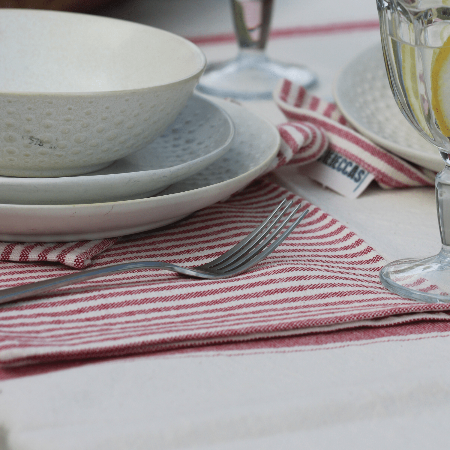 - Diseño a rayas finas en color rojo bermellón y crudo